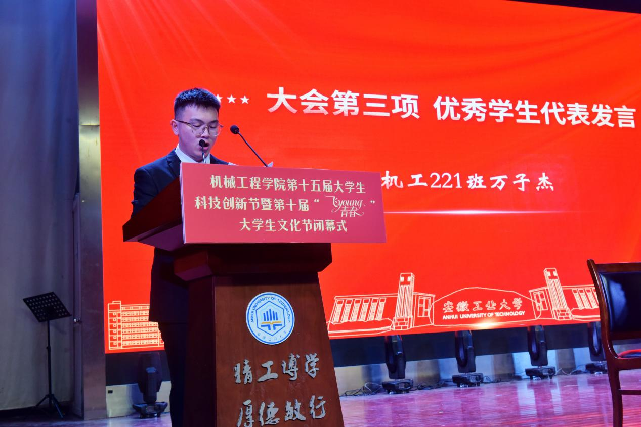 优秀学生代表机工 221 班万子杰同学分享了自己在科技创新与实践活动中的成长经历与感悟,他表示将以此次表彰为契机,继续深耕专业、勇于探索,不负学院培养与领导期望,为科技创新事业添砖加瓦。