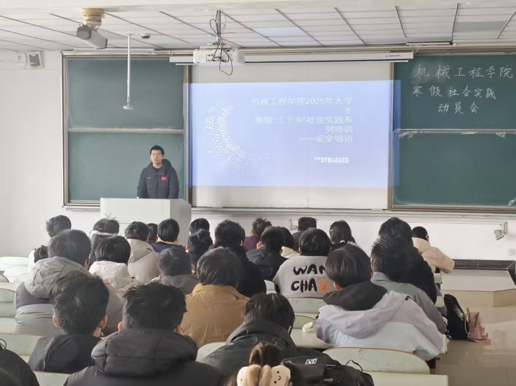 1 月 9 日,动员会在秀山校区机械楼学术报告厅拉开帷幕。学院团委书记王丹丹首先传达学校社会实践工作整体安排,深刻阐释 “返家乡” 实践的育人内涵与时代价值,强调这是机械工程专业学子将理论知识与生产实践相结合、深化专业认知的重要路径,鼓励同学们以 “带着问题调研、带着成果返程” 的务实态度投身家乡建设。会上,学院详细解读实践 “三大方向”“三大专项” 的具体任务,明确团队组建、流程报备、成果提交等关键要求,倡导跨班级、跨专业组队协作,确保实践活动接地气、有深度、见实效。同时,结合高校社会实践典型安全案例,从出行交通、现场实践、财产保护、网络信息等多维度开展警示教育,着重强调通讯畅通与每日行程报备制度,筑牢安全防线。