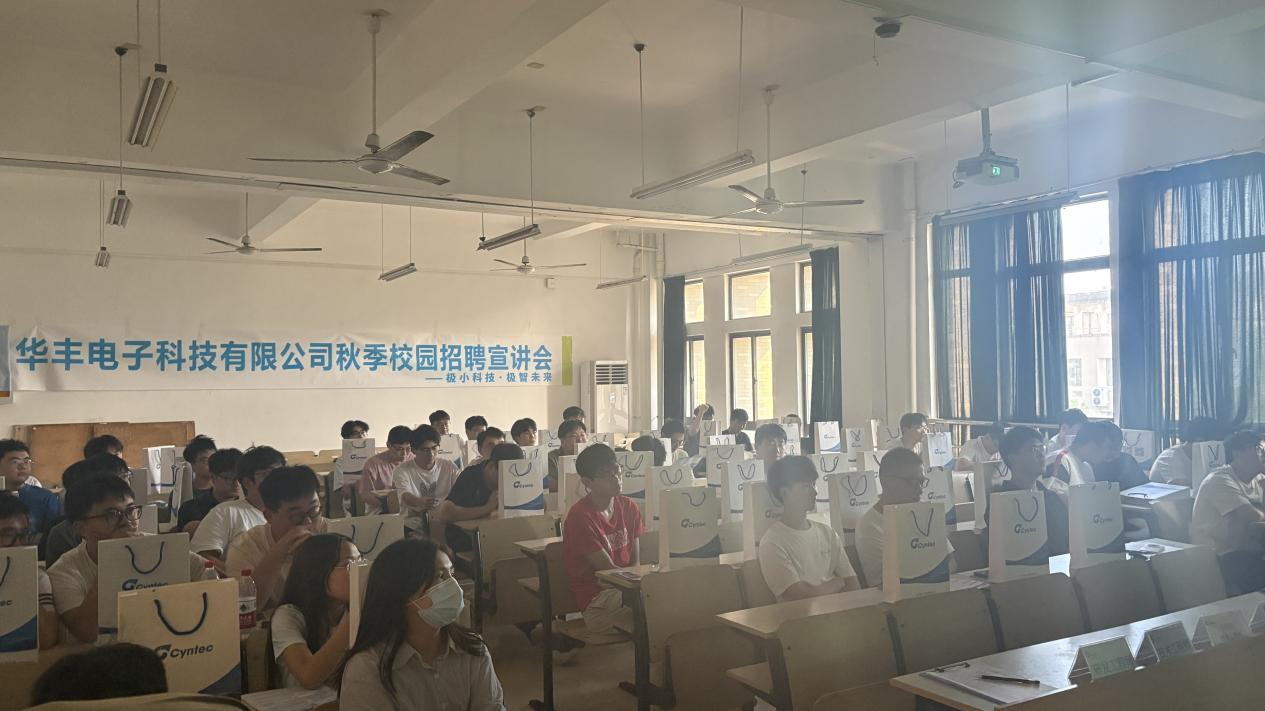 华丰电子科技有限公司宣讲人员围绕企业发展历程、技术优势及招聘岗位展开介绍。该企业深耕材料科学、微型化等技术领域,此次面向我院开放机械电气类的机构工程师、电控工程师等岗位,同时还涉及研发、质量管理等多类岗位。此外,宣讲人员还介绍了企业五险一金、住宿条件、丰富团建等福利体系与清晰的招聘流程。