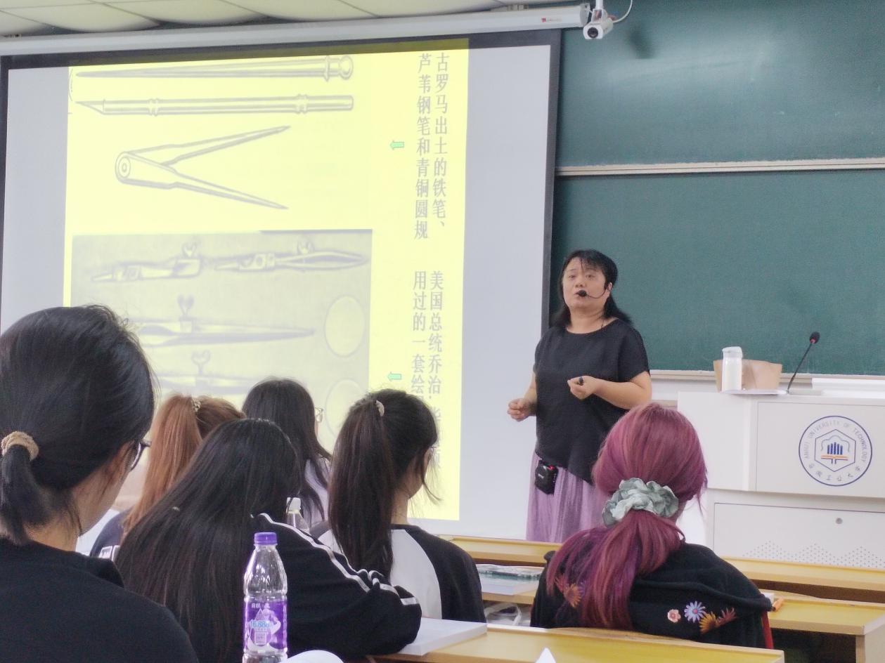 卢旭珍老师讲授的内容为绪论章节“图形的起源”。通过讲授国内外古代及近代有关图样来讲解图学的发展历史,让同学们了解《工程制图》课程在漫长的发展过程中,形成了璀璨的历史文化。人类发展的历史,实际上也就是一部图学技术发展的历史,图学史的本身是人类思维方式、思维品质的写照。通过列举国内的港珠澳大桥、三峡工程、高铁、首艘国产航母山东舰、世界最大吨位模锻压力机的建设与制造,以及目前我国刚刚建设的世界第一高桥“贵州花江峡谷大桥”等具体事例,引导学生要关注时事,并引出这些宏大的工程设计是离不开图样的,让学生明白图学兴则科技兴,非图无以制器等道理,从而让学生懂得学习制图的重要性,同时以上事例也展现出我国的大国风采,从而激发学生的爱国主义情怀,增强民族自豪感和自信心。