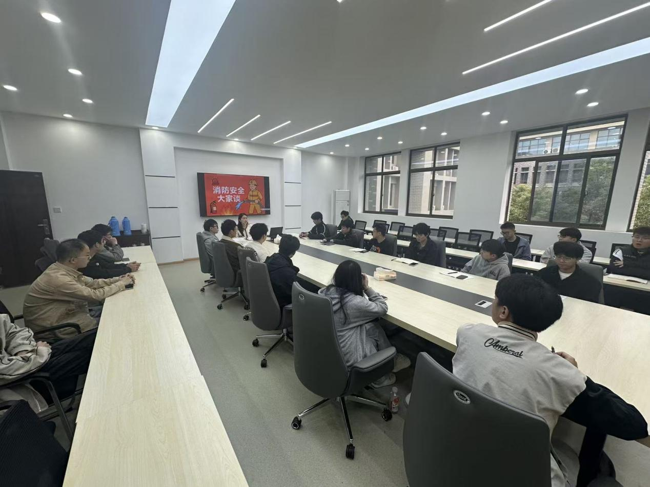 在交流讨论环节,各参会代表结合各班级宿舍管理情况进行发言。硕机243班王俊龙分享了宿舍安全自查的做法,希望学院能定期组织消防安全实操培训,让更多同学掌握灭火器使用技能。